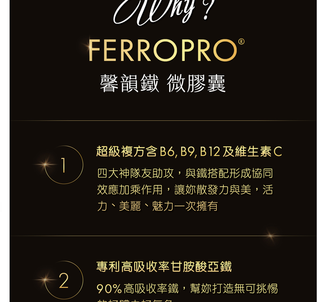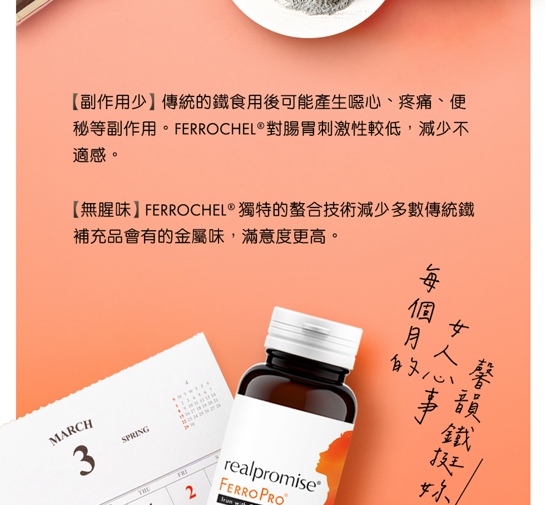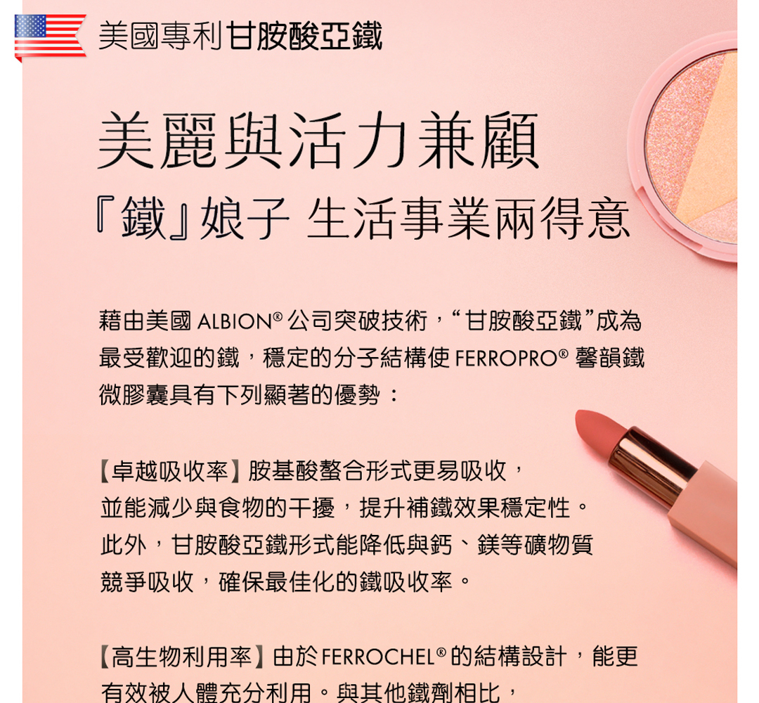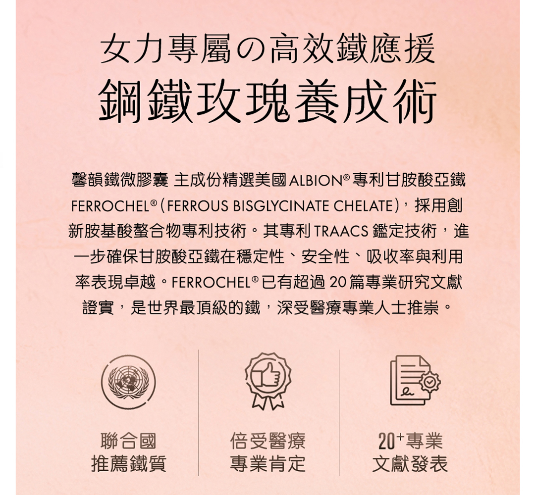 • 精選美國專利 Ferrochel® 甘胺酸亞鐵,臨床實證 9 成以上吸收率,好吸收不便祕。