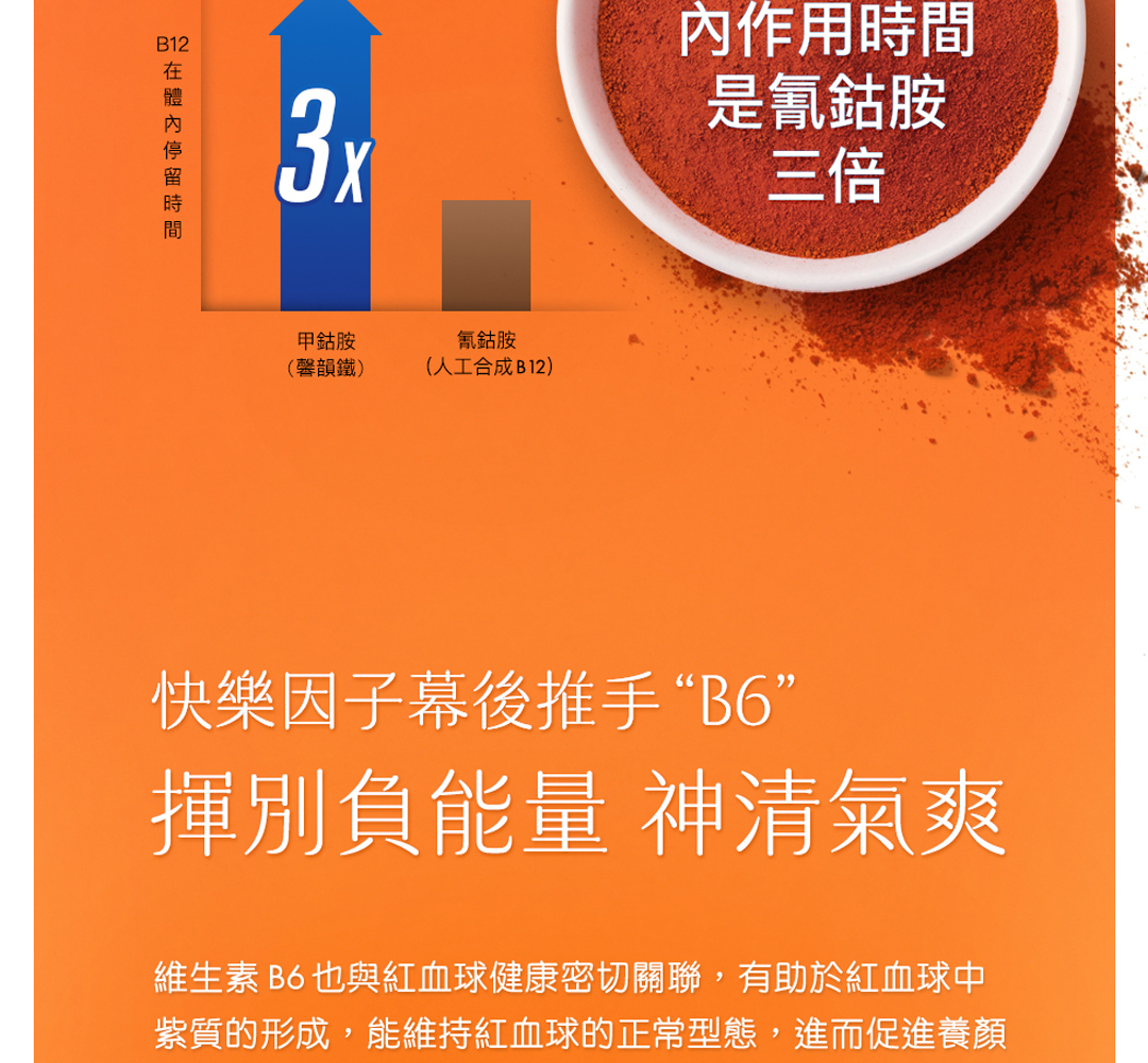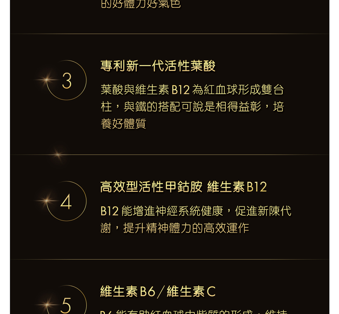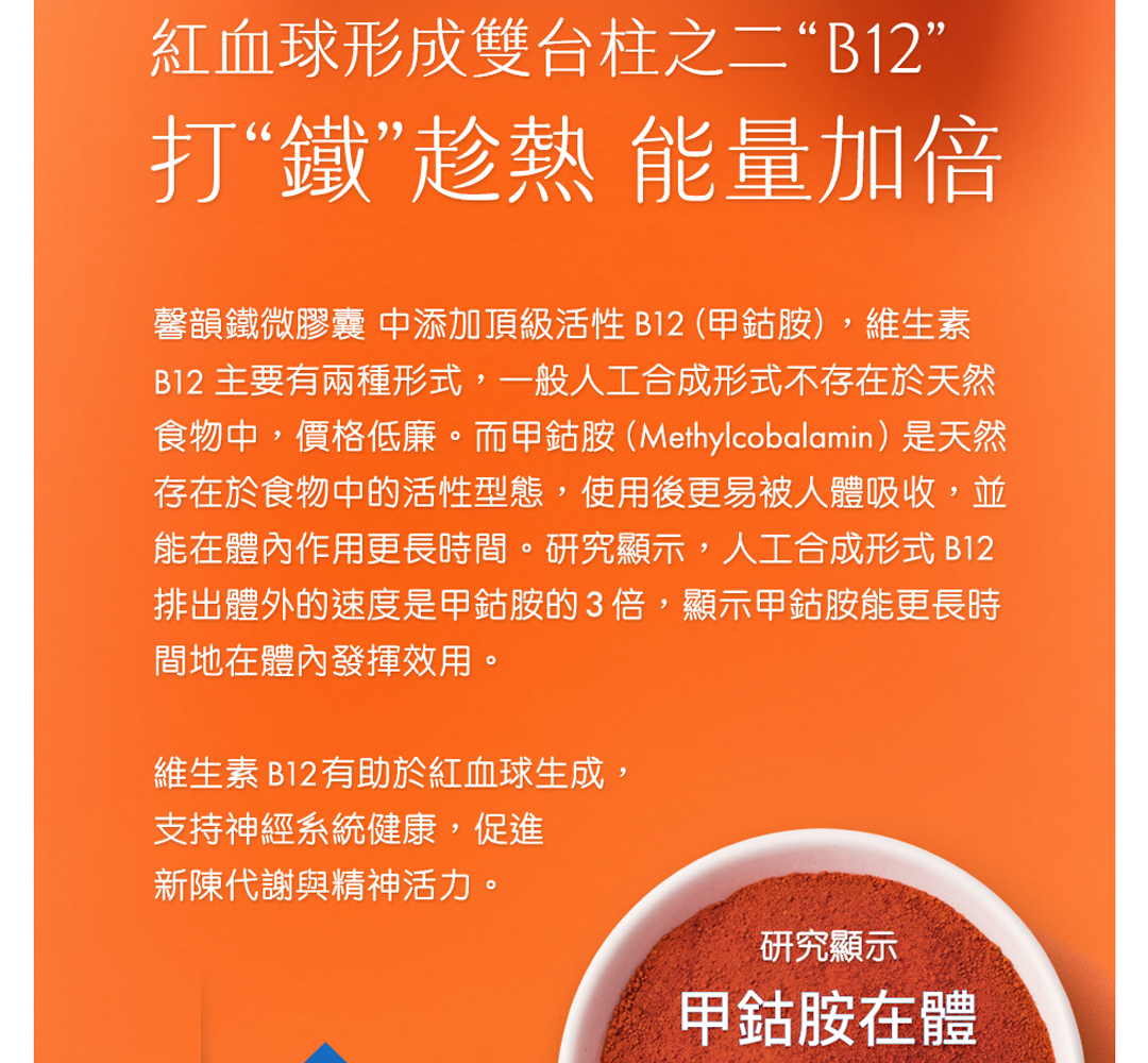 ▫ 維生素 B12:精選活性形式 B12-甲鈷胺,高效能有助於紅血球的形成