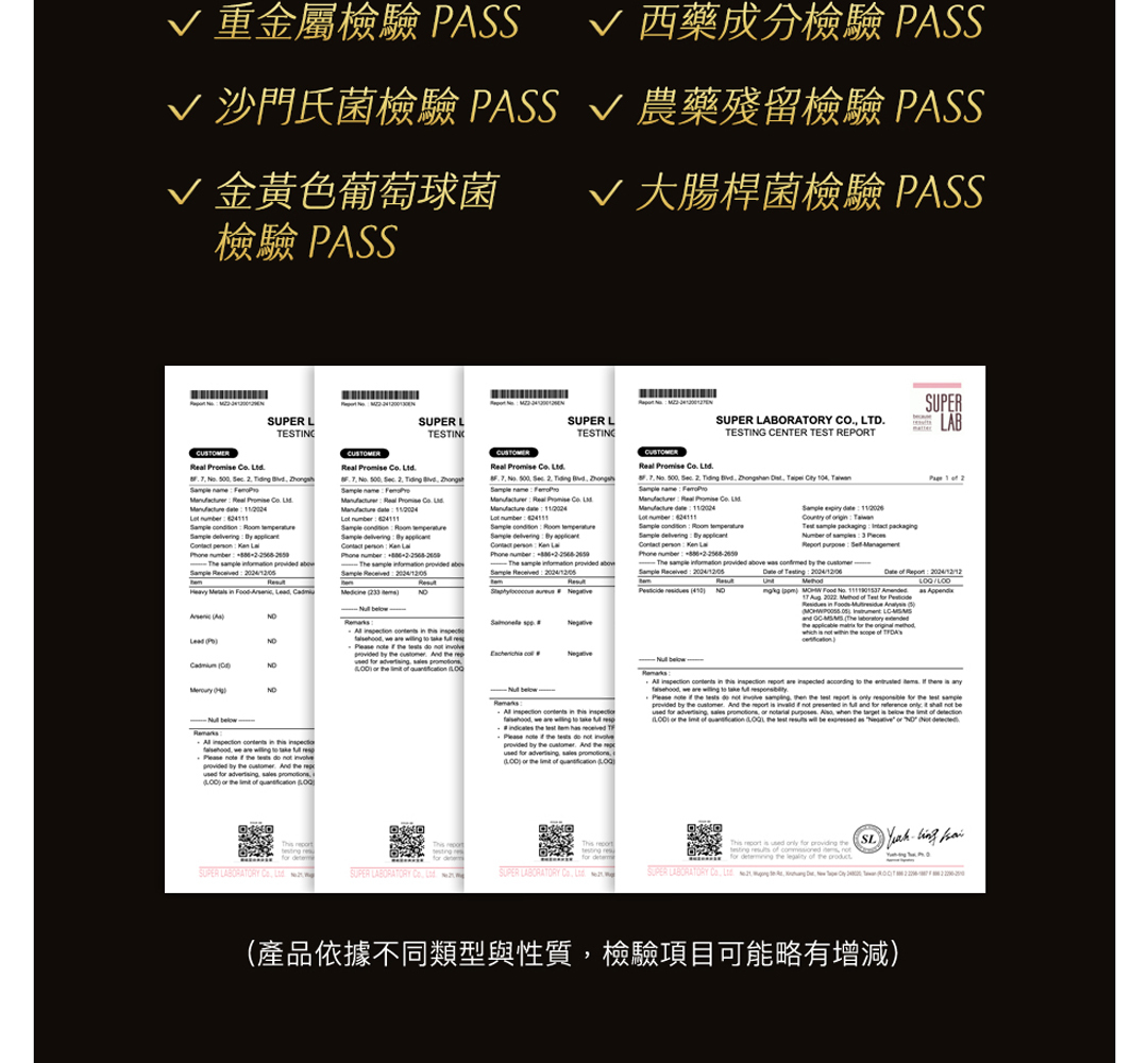 • 	全批次經第三方公正單位實驗室檢驗,報告公開透明。