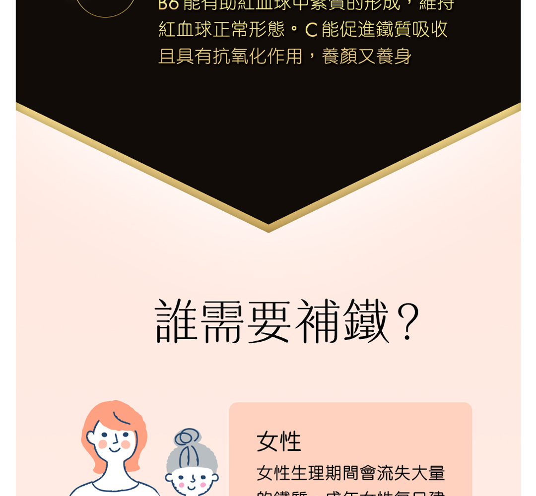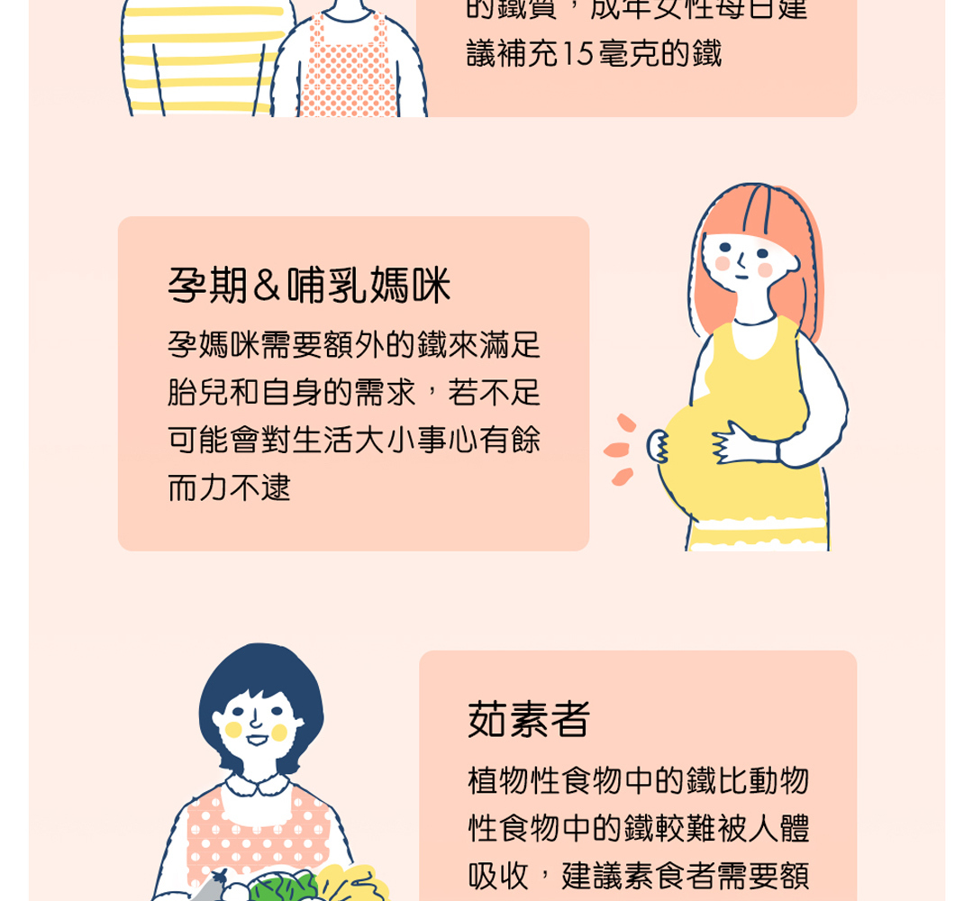 • 孕婦與哺乳期婦女:胎兒發育與母體需求增加,需額外鐵質支持