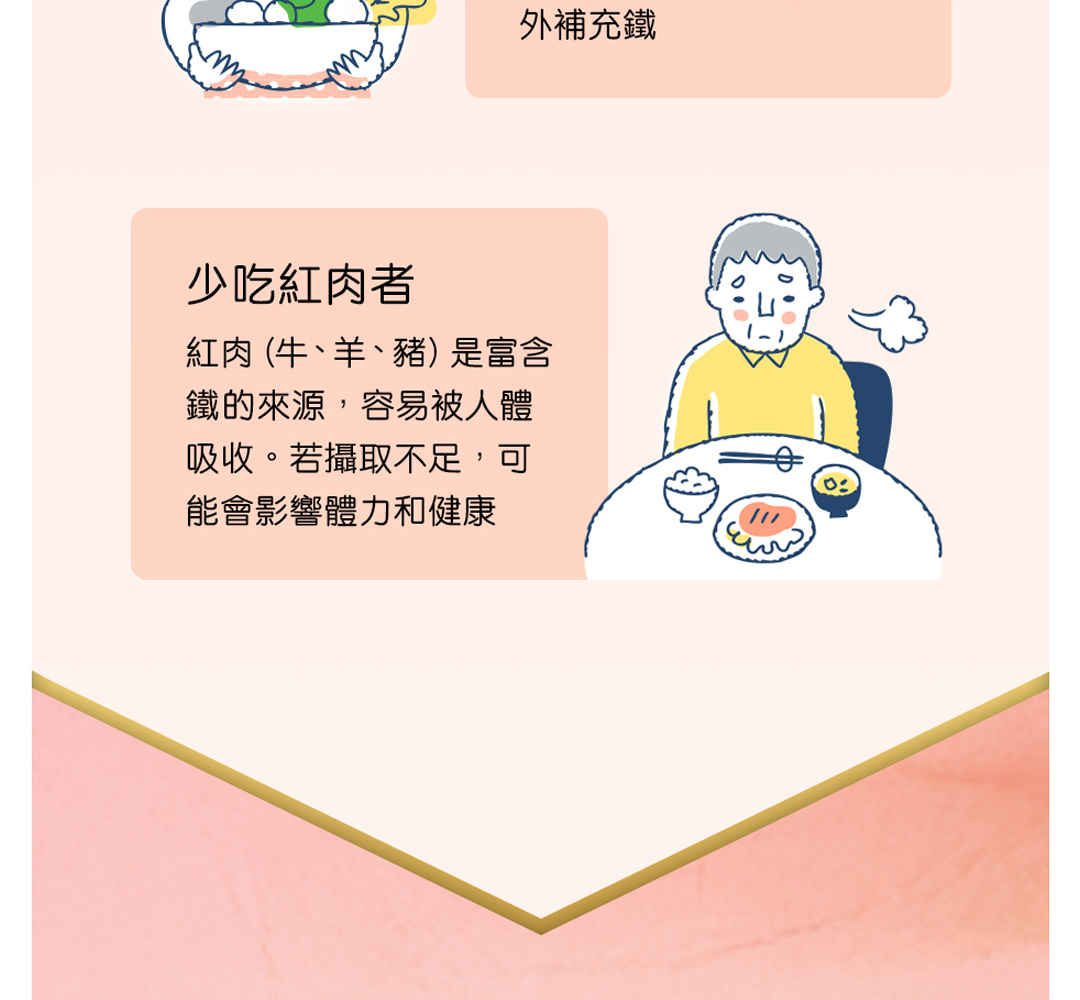 • 素食者:缺乏富含鐵的動物性食物,植物性來源鐵吸收率較低