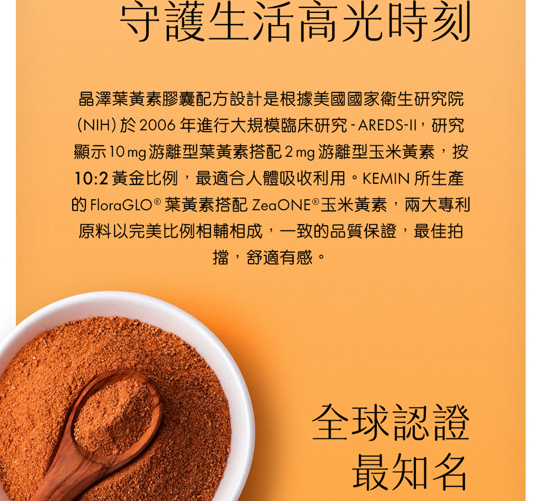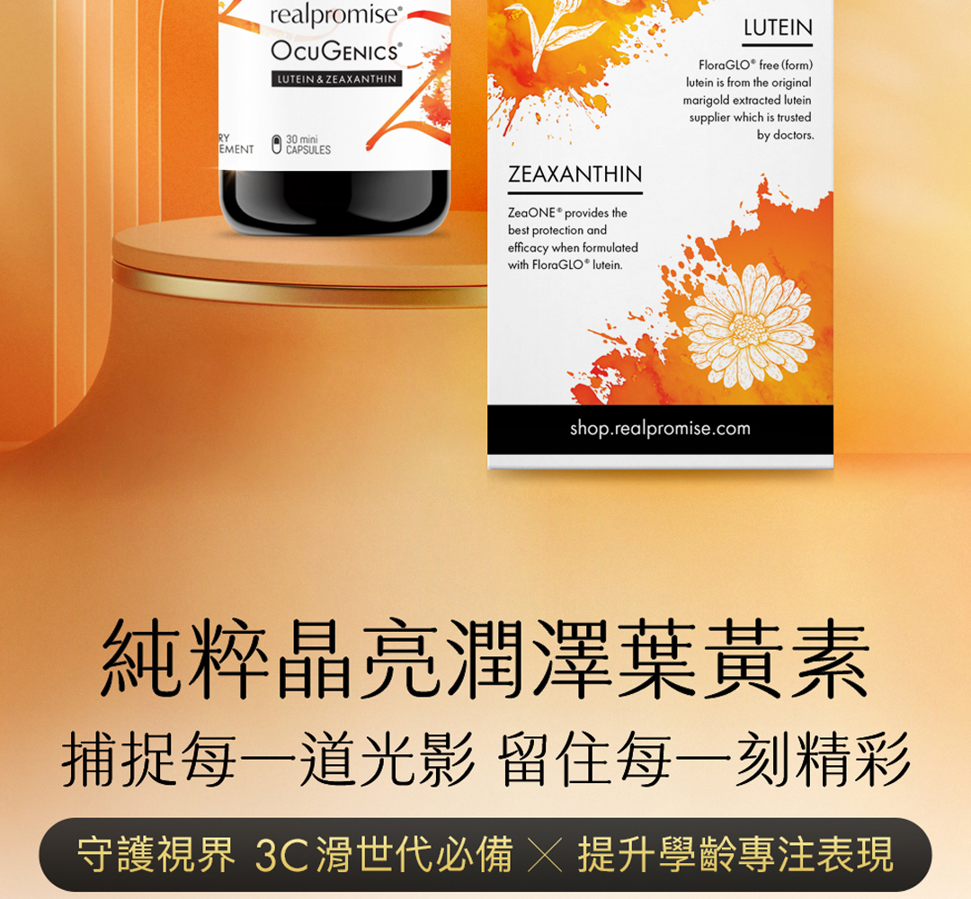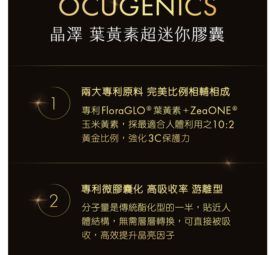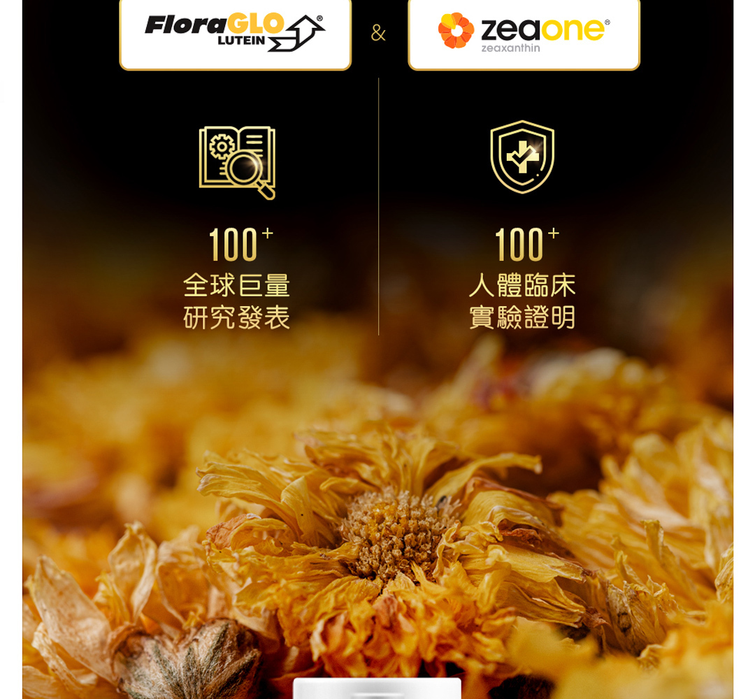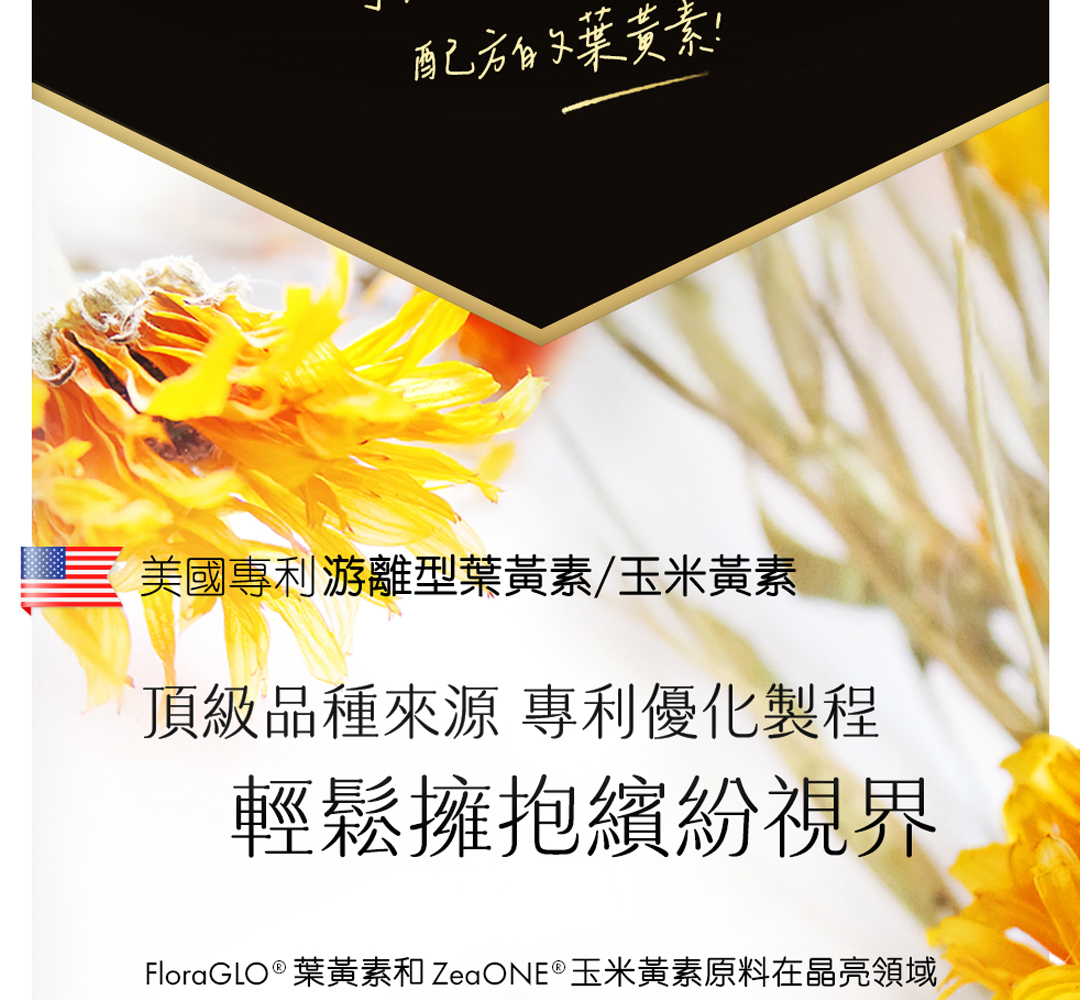 特色 | 專利游離型 FloraGLO® 葉黃素 + ZeaONE® 玉米黃素