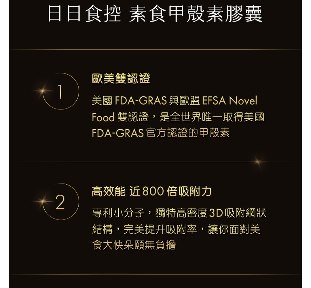 【日日食控】幾丁聚糖 (素食甲殼素) 膠囊精選純素型甲殼素,來自歐洲比利時大廠 KitoZyme,使用微生物發酵技術研發高吸收率甲殼素 KiOnutrime-CsG®,獨特 3D 高密度吸附結構提供近 800 倍吸附力,同時是唯一美國 FDA 以及歐洲 Novel Food 雙認證頂級原料,8 篇科學文獻發表實證飲食油脂最佳對策。